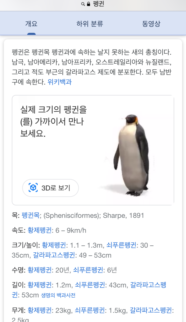 구글에 그냥 '펭귄' 이라고 검색한뒤 3D로 보기 -> 증강현실을 터치하면 우리집으로 펭귄을 불러올 수 있다