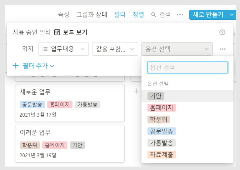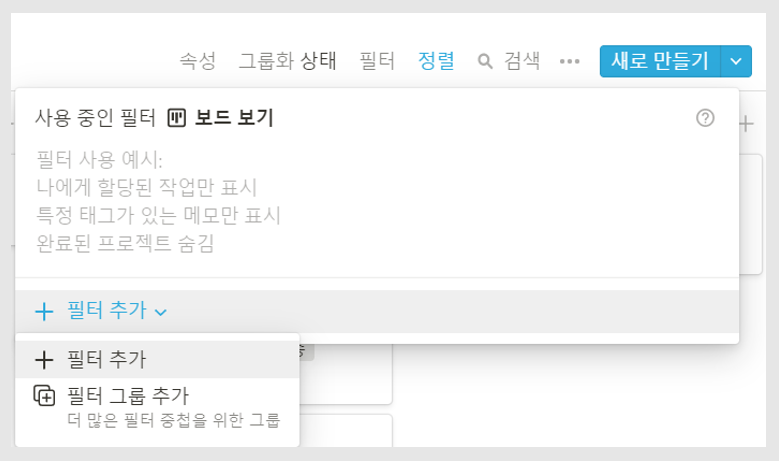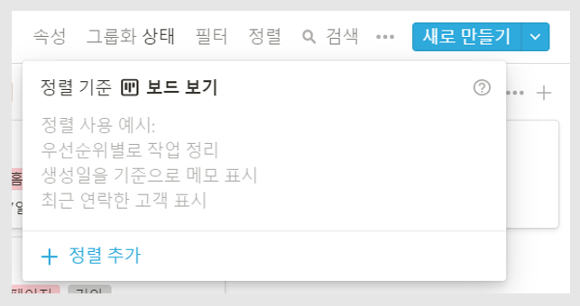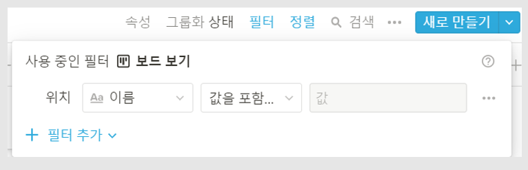 이 화면에서 '+새로 만들기'를 눌러 행을 추가하면, 보드 보기에서 카드를 추가하는 것과 똑같아요!