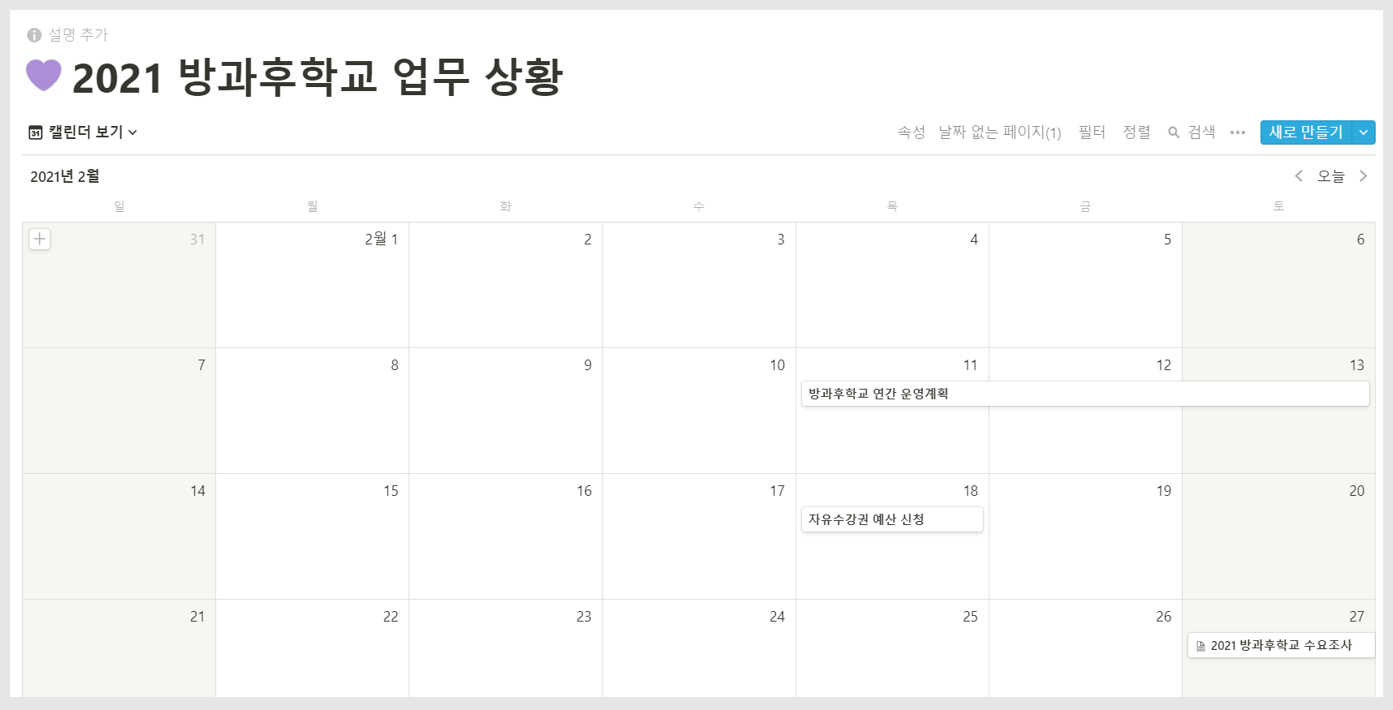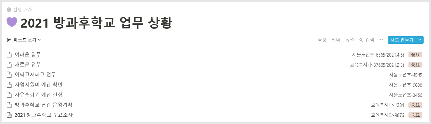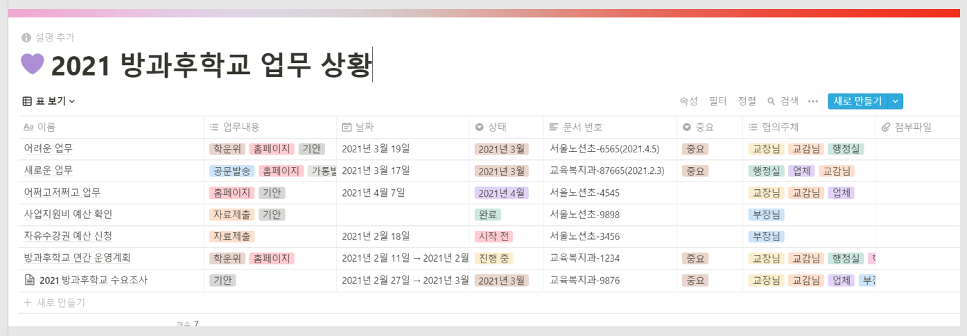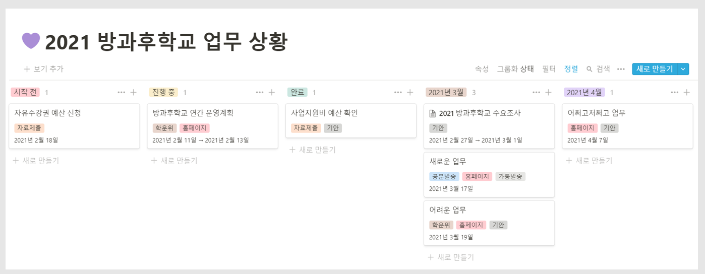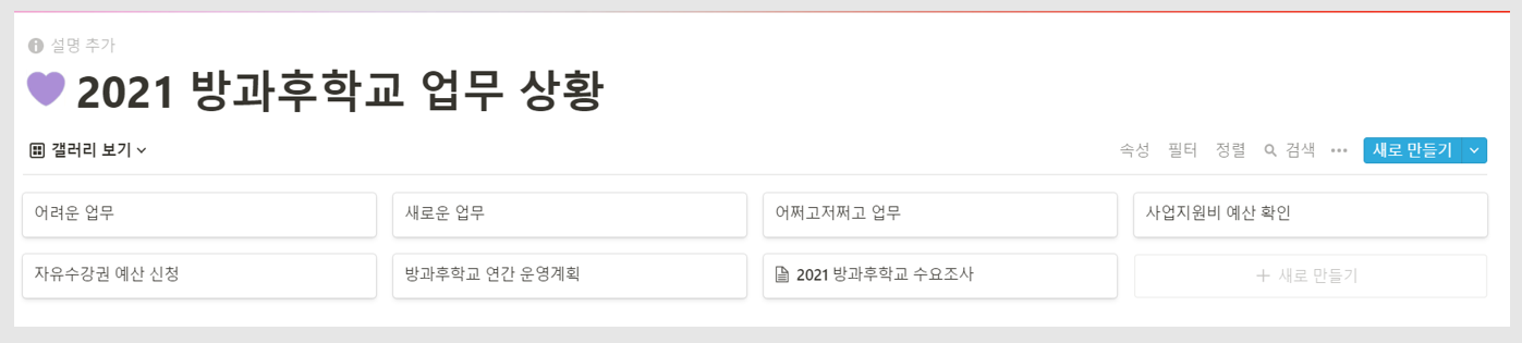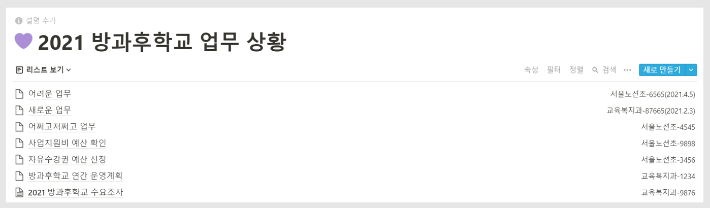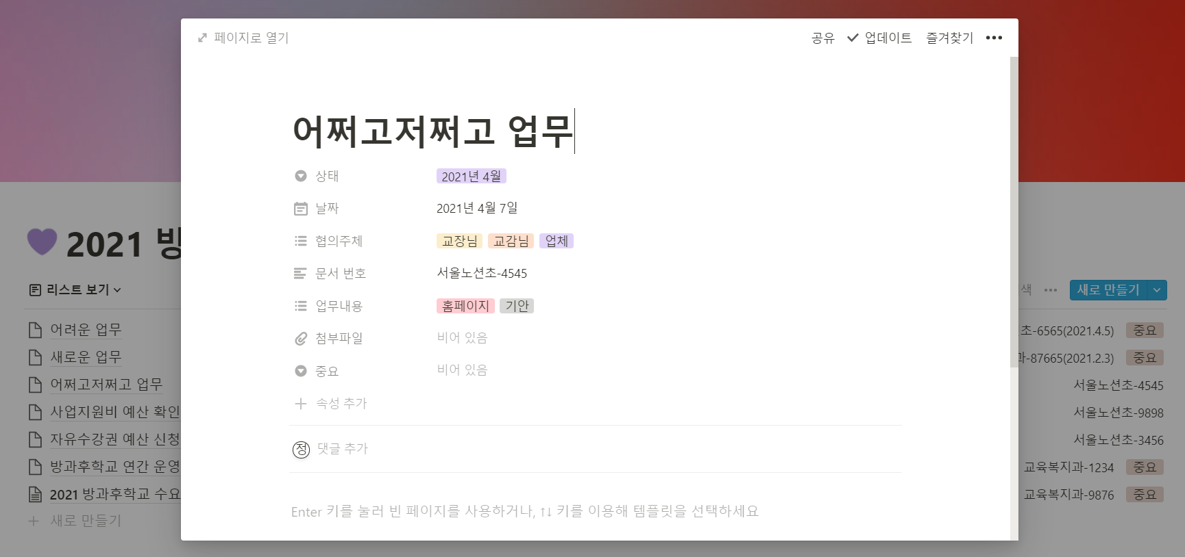 '2021 방과후학교 업무 상황' 이라는 페이지 안에서는