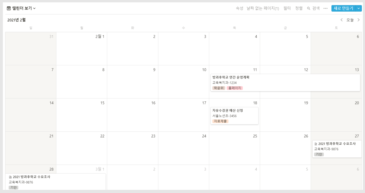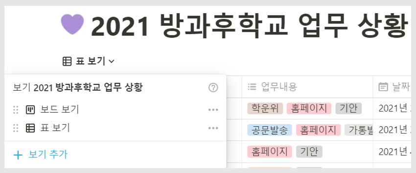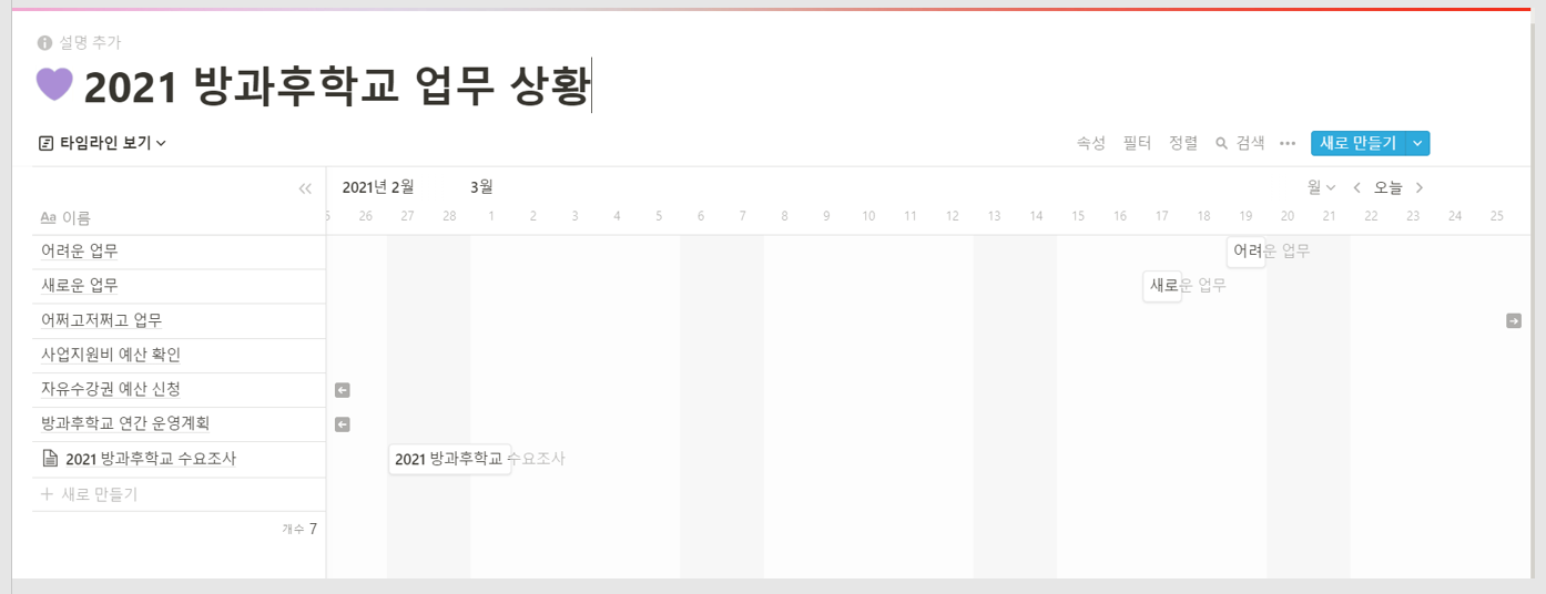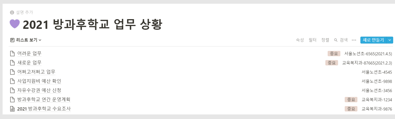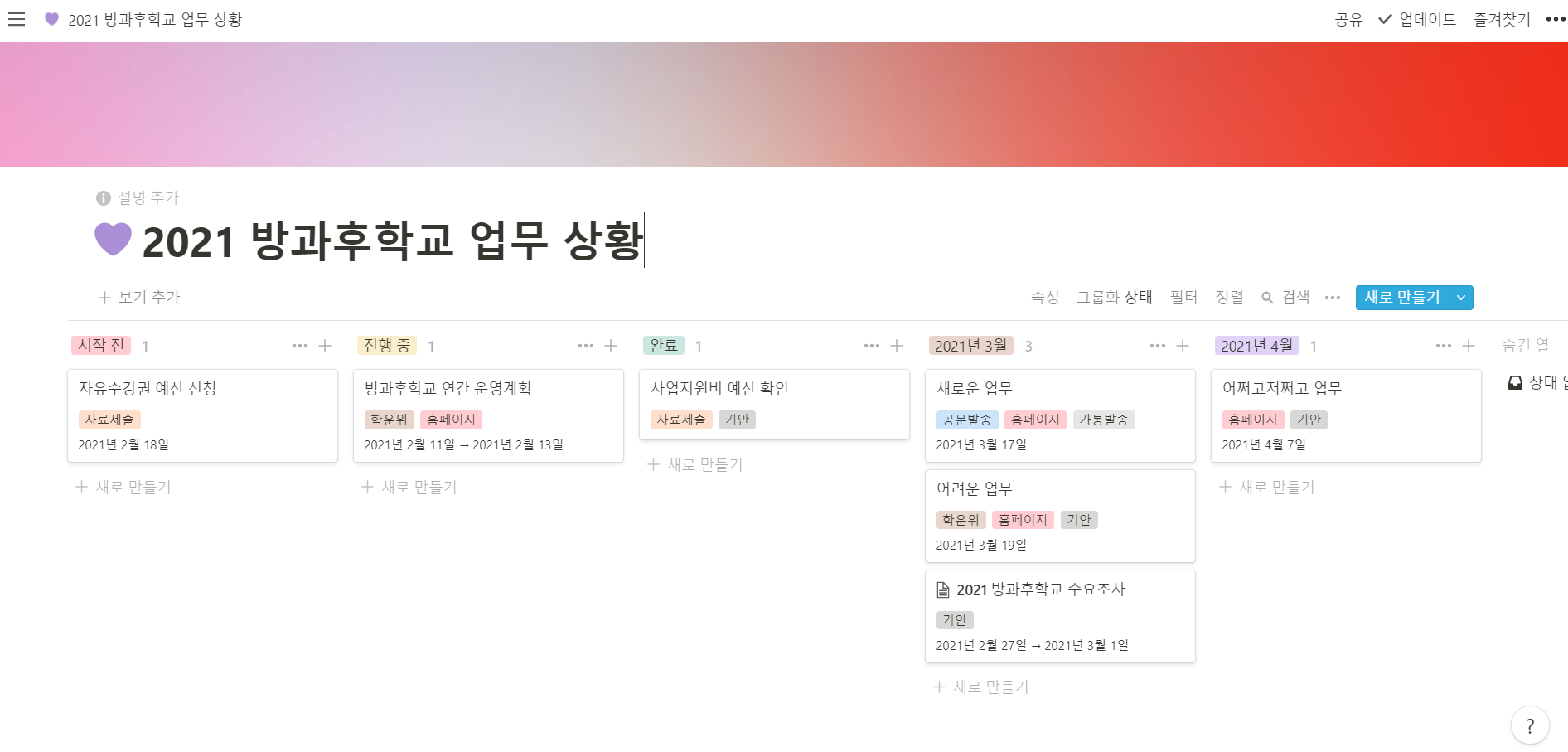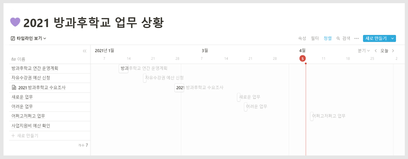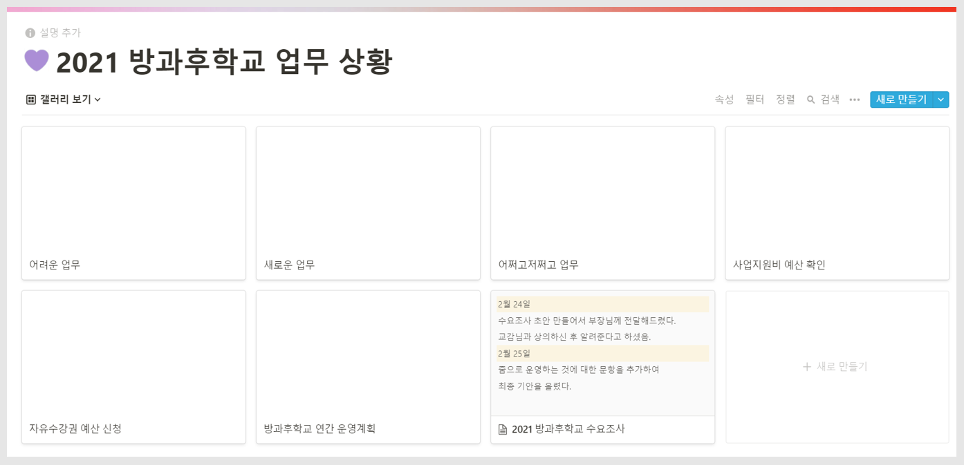 '2021 방과후학교 업무 상황' 이라는 페이지 안에서는