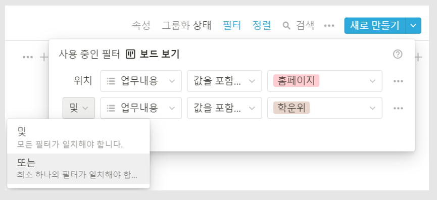 '홈페이지 또는 학운위'라고 필터를 입히면 두 가지 중 하나만 갖고있어도 카드가 보입니다.