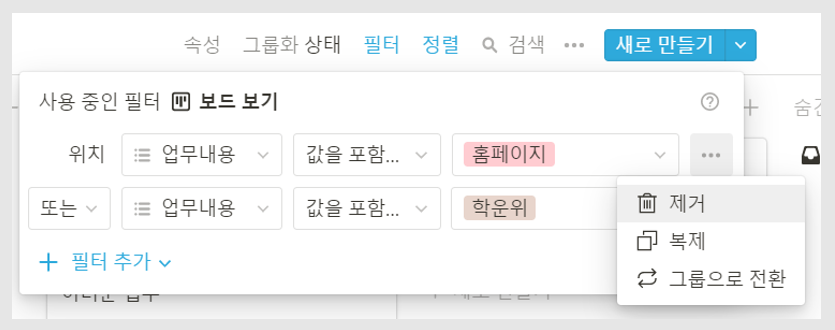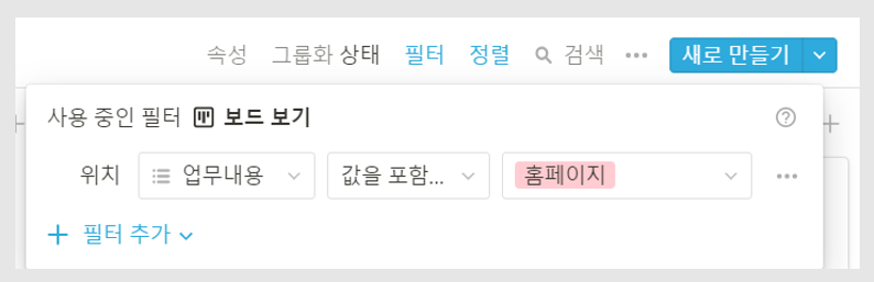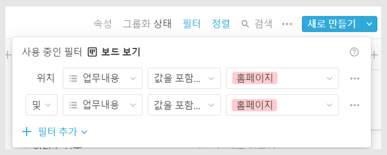 그럼 '홈페이지'라는 값을 포함하는 카드만 필터로 걸러 보여줄거예요!