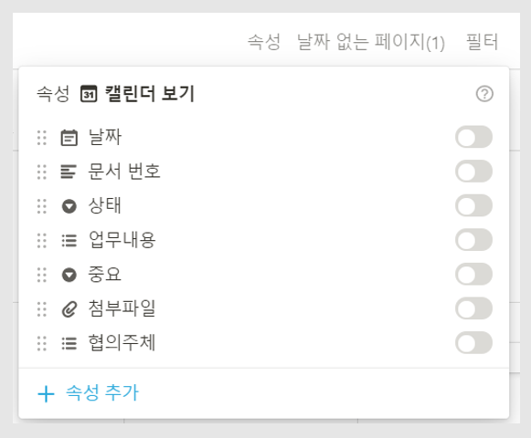 아직 캘린더 속성, 필터, 정렬에는 회색으로 비활성화 되어있죠!