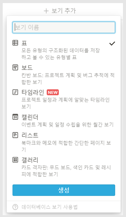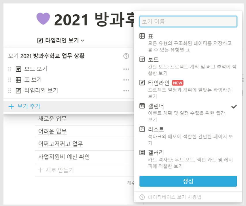 다시 타임라인 보기 클릭 -> 보기 추가 -> 캘린더 선택 -> 생성을 눌러주세요.