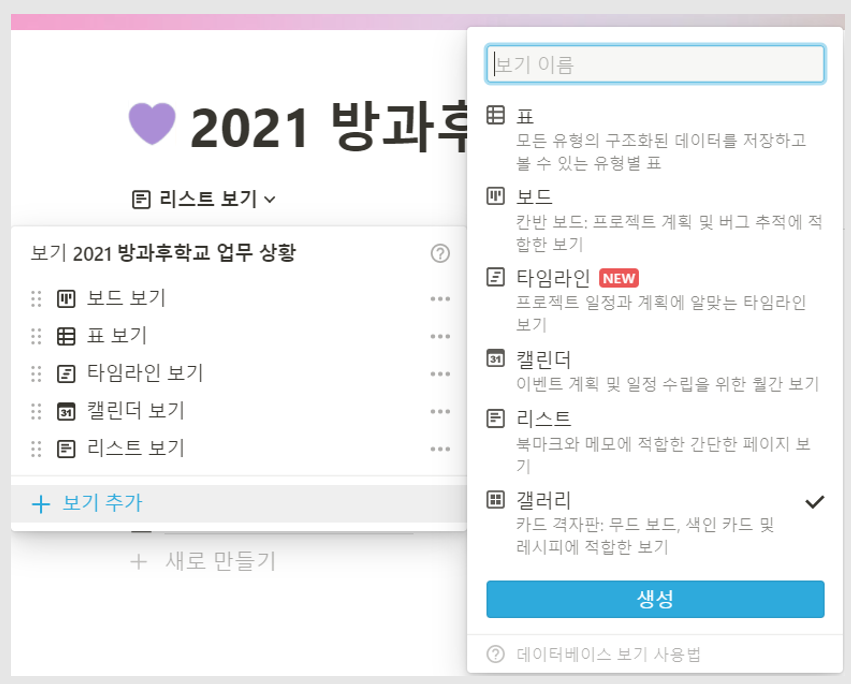 보기 추가 -> 갤러리 선택 -> 생성을 눌러주세요