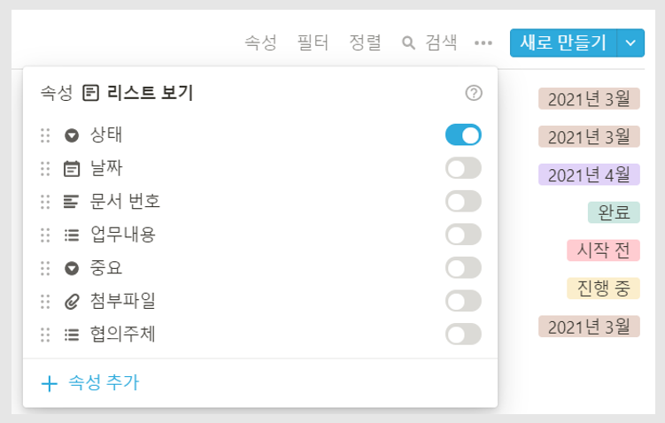 속성 중에서 '상태' 만 보이도록 설정되어있는 것을 알 수 있습니다.