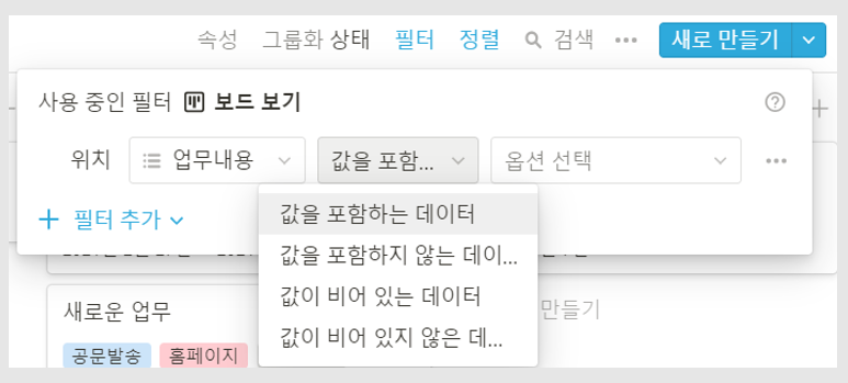 값이 비어있는 데이터 : 업무 내용에 아무 선택지도 선택 안된, '비어있음' 상태의 카드만 보여줍니다.