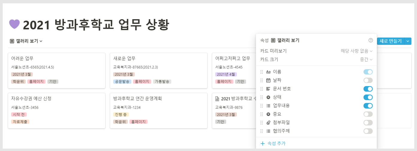 문서번호, 상태, 업무내용을 선택했더니 카드가 다음과 같이 알록달록 예쁘게 바뀌었습니다.