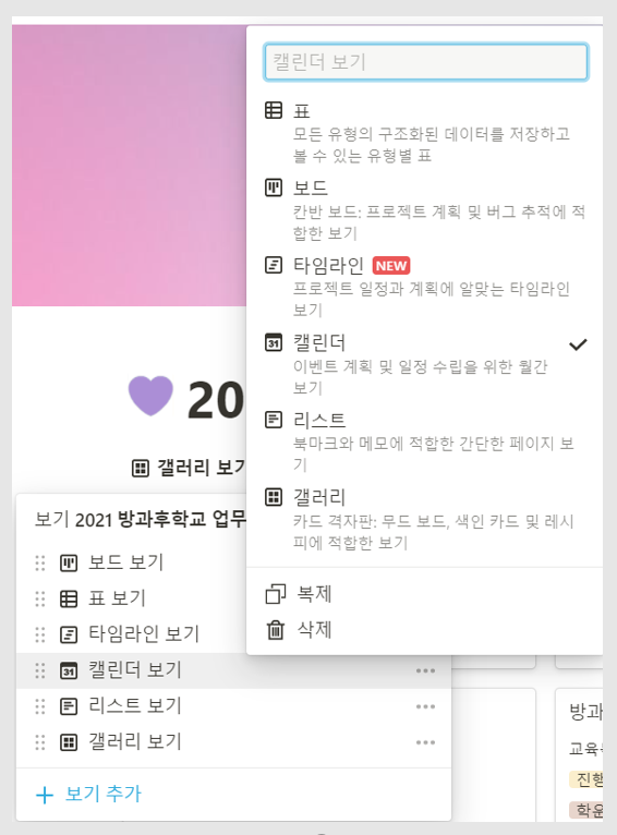 저는 보드, 타임라인, 표 보기만 남겨두고 나머지는 삭제하도록 하겠습니다.