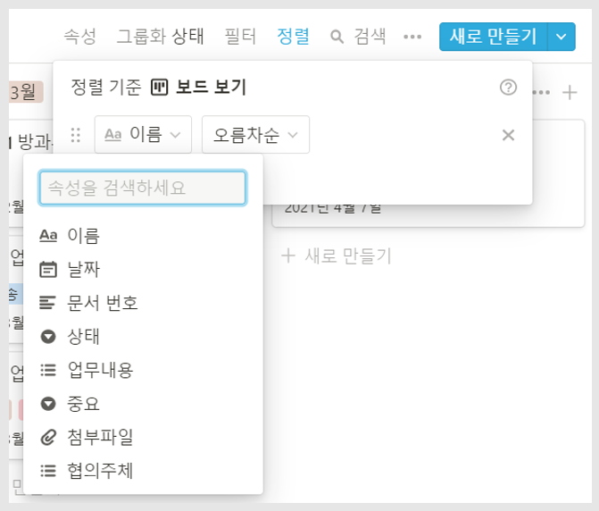 우리는 날짜로 정렬하고 싶으므로 이름을 클릭해서 아래 나오는 속성 중 '날짜'를 선택해줍니다.