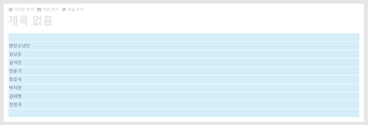 예를 들어, 방탄소년단 블럭에 커서를 놓고 엔터를 치면 긴 블럭이 하나 생성됩니다.