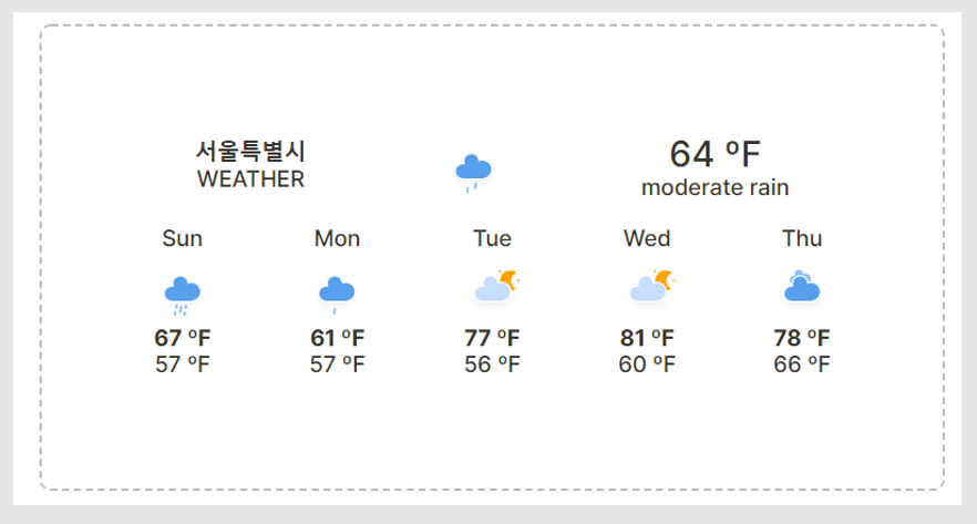 Weather location : 지역 설정입니다. 기본은 샌프란시스코로 되어 있는데, 클릭해서 글씨를 지운뒤 Seoul 로 바꿔주세요