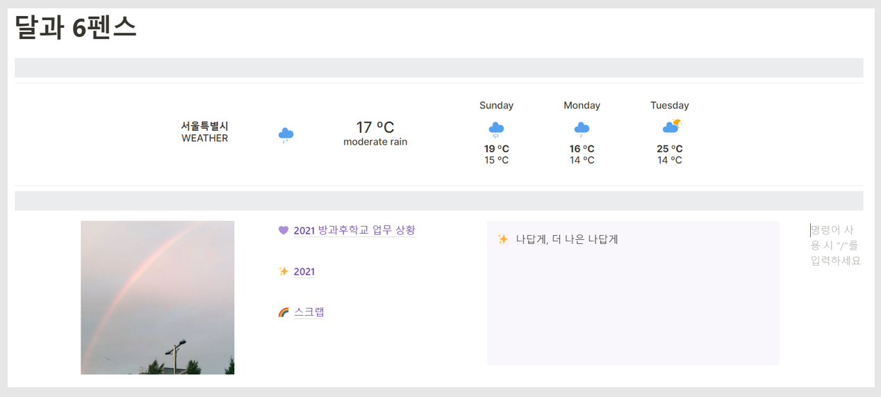 노션으로 학교 업무하기_7 : : 대시보드 꾸미기(indify 카운트다운, 날씨 위젯) (2) | 2021.05.16 |