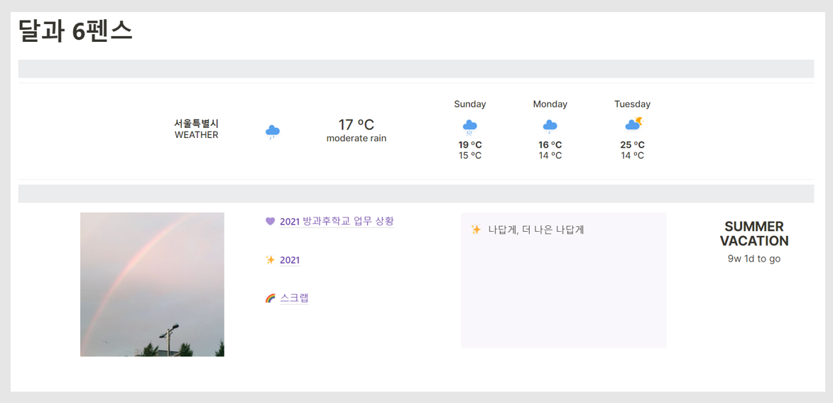 | 노션으로 학교 업무하기_6 : : 대시보드 꾸미기(indify 날씨 위젯) (0) | 2021.05.16 |
