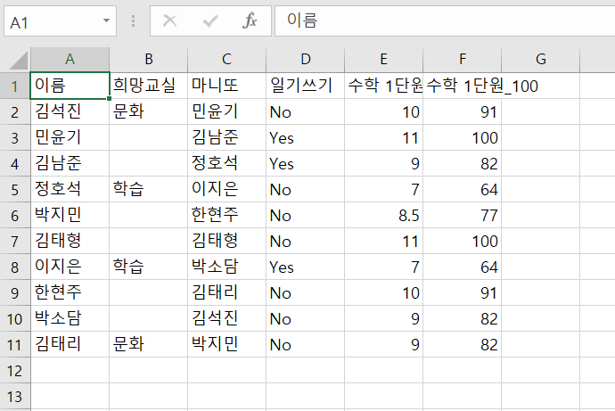 3. 이름 칸에 학생들 이름을 하나씩 넣어주세요.