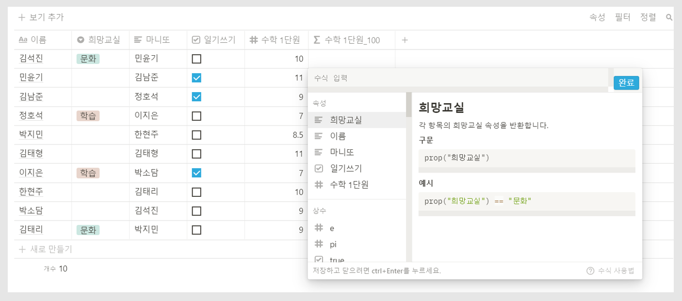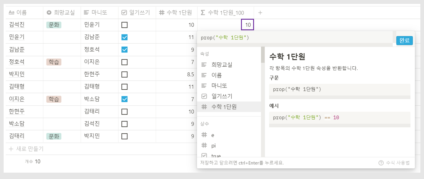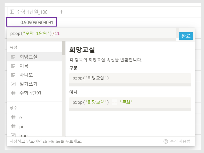 그 밑의 상수, 연산자, 함수 등등은 노션에서 기본적으로 제공해주는 수식들입니다.