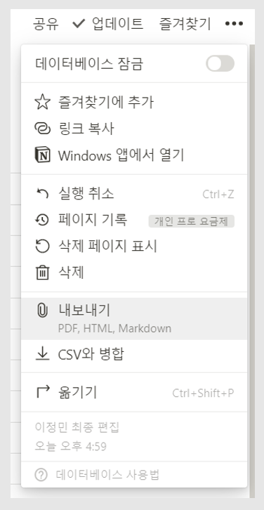 화면 오른쪽 상단의 점 세 개 클릭 후 '내보내기' 를 선택해주세요.