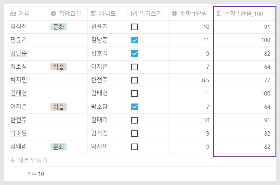 '학생의 점수'는 속성에서 '#수학 1단원' 에 들어가있는 값입니다.