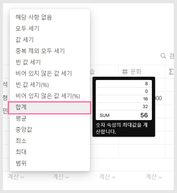 계산을 클릭하면 다양한 옵션이 나옵니다.