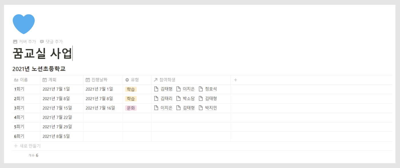 노션으로 학급 관리하기_2 : : 각종 프로그램, 사업 진행하기 (0) | 2021.07.29 |