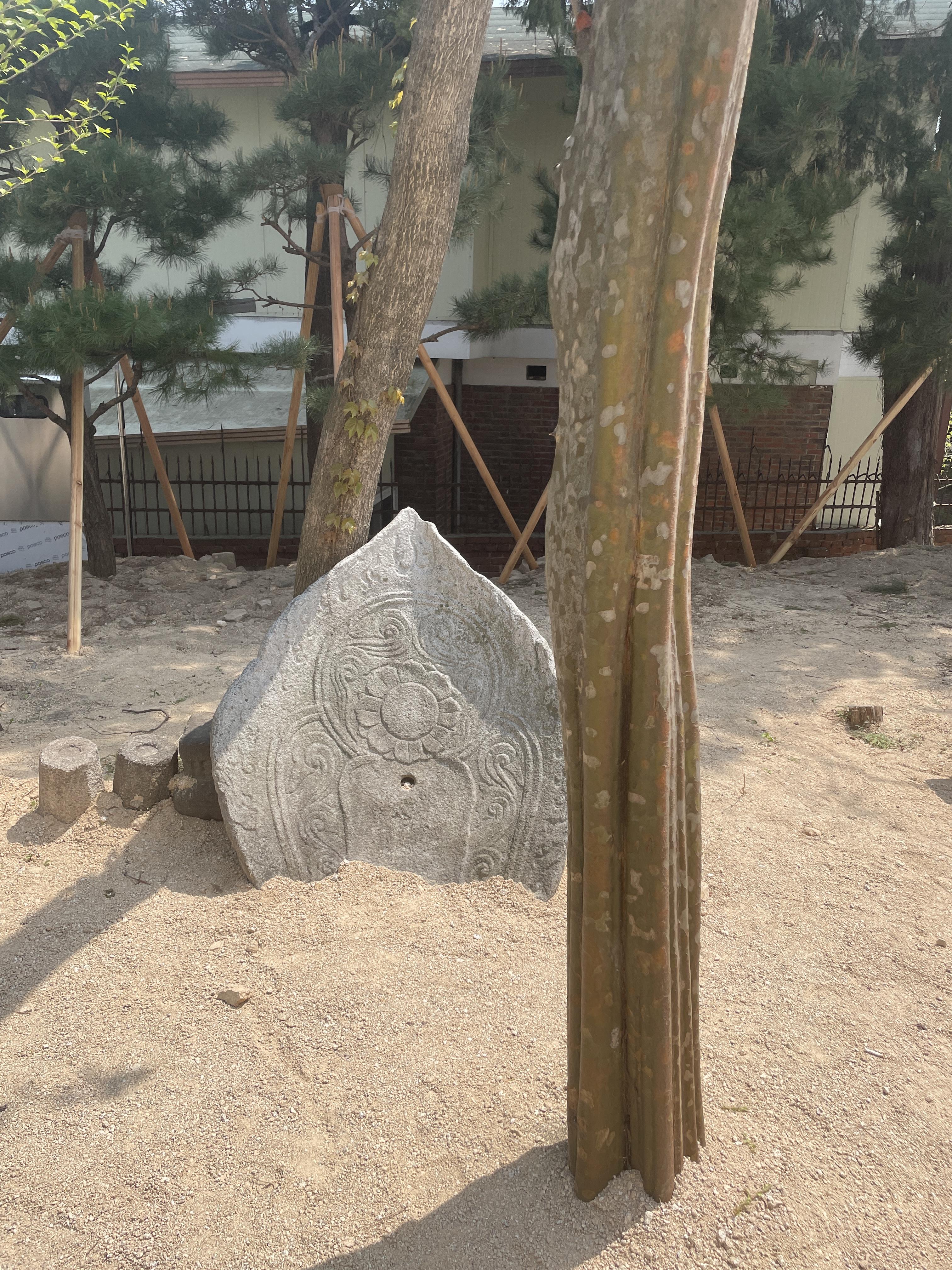 왼쪽으로 보이는 모습이다. 몇 그로 안되는 나무 사이에 돌이 떡하니 박혀있는게 인상적이었다. 어느 지붕에 달려있었던걸까.