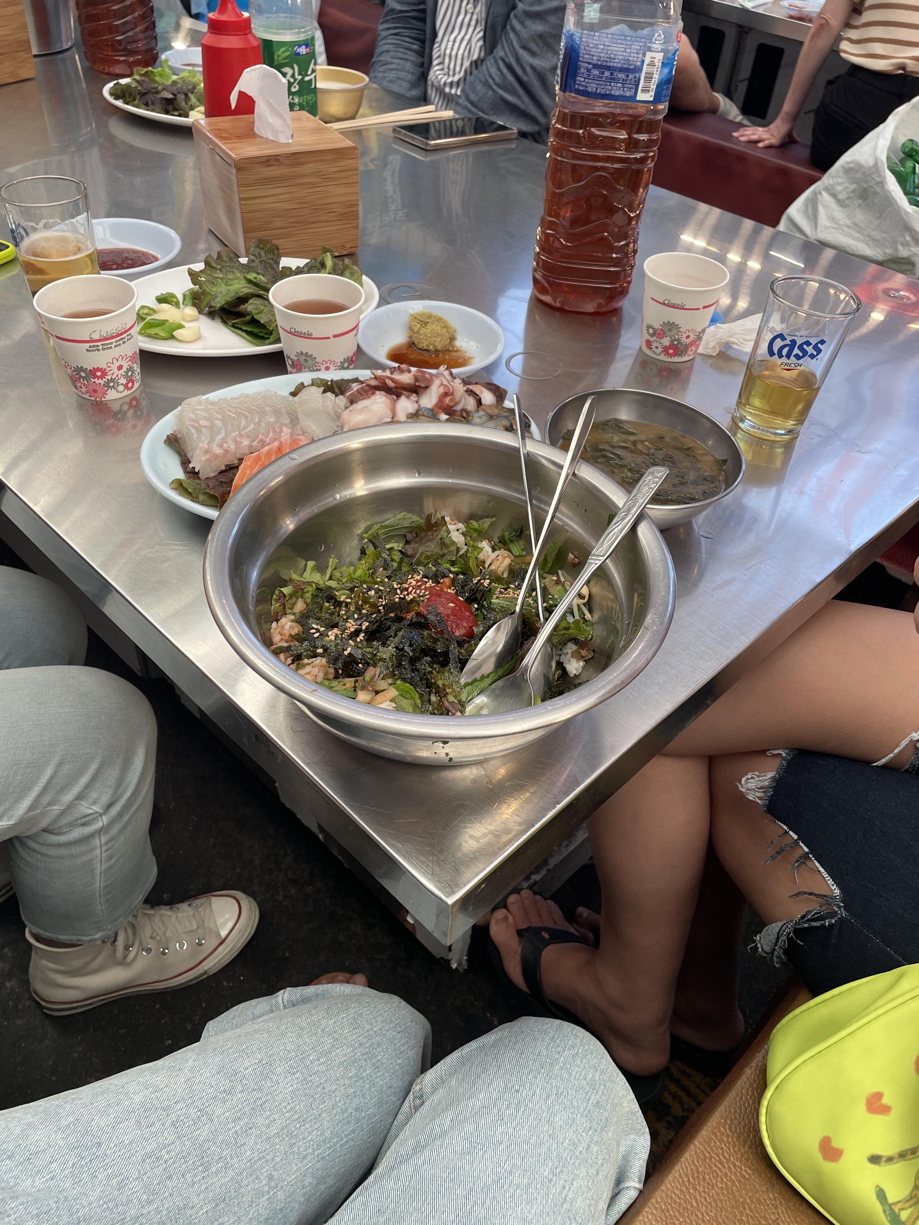 오랜만에 방문한 광장시장에서 새로운 메뉴를 도전해보았다. 이때부터 본격 더위가 시작하던 터라 좀 더웠는데 에어컨 없이 선풍기 바람 아래 땀흘리며 먹는 낭만이 있었다. ‘전라도 횟집‘에서 기대하지 않고 시킨 회가 너무 싱싱하고 맛있었다. 진짜, 진짜 싱싱했다. 해삼도 쫀득쫀득하고,,나는 광어를 별로 좋아하지 않는데 여기서 먹은 광어가 그렇게 맛있었다. 옆집에서 비빔밥 포장(?)해와서 먹는 재미도 있었다 ㅋㅋㅋㅋ물도 심지어 결명자차! 그동안 광장시장에서는 육회 아니면 빈대떡만 먹었는데 새로운 메뉴를 개척해서 좋았다. 이날 2차로 먹은 육회도 엄청 맛있었는데 사진이 없넹 ㅎㅎ