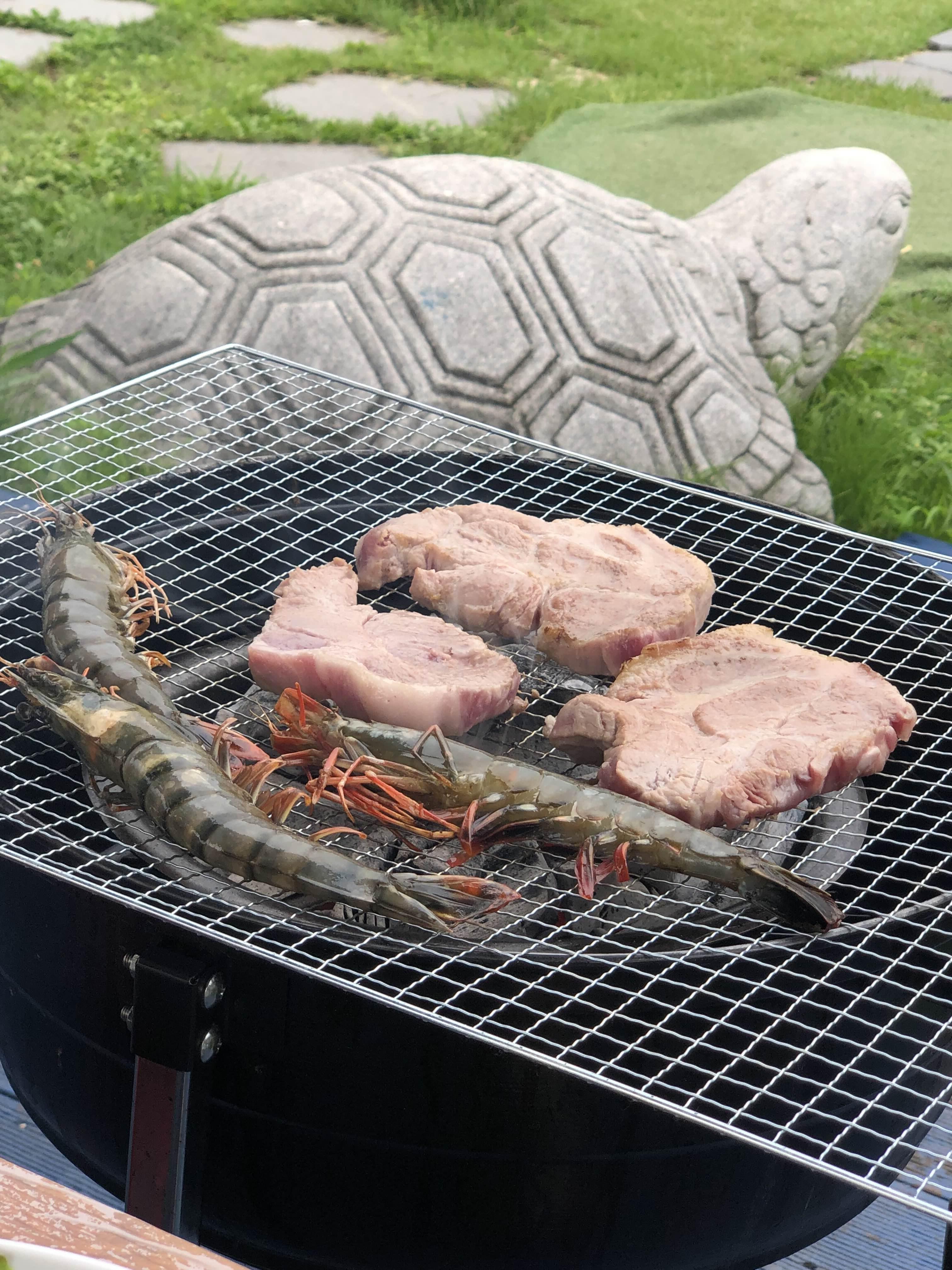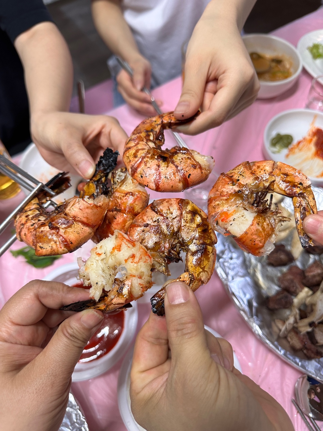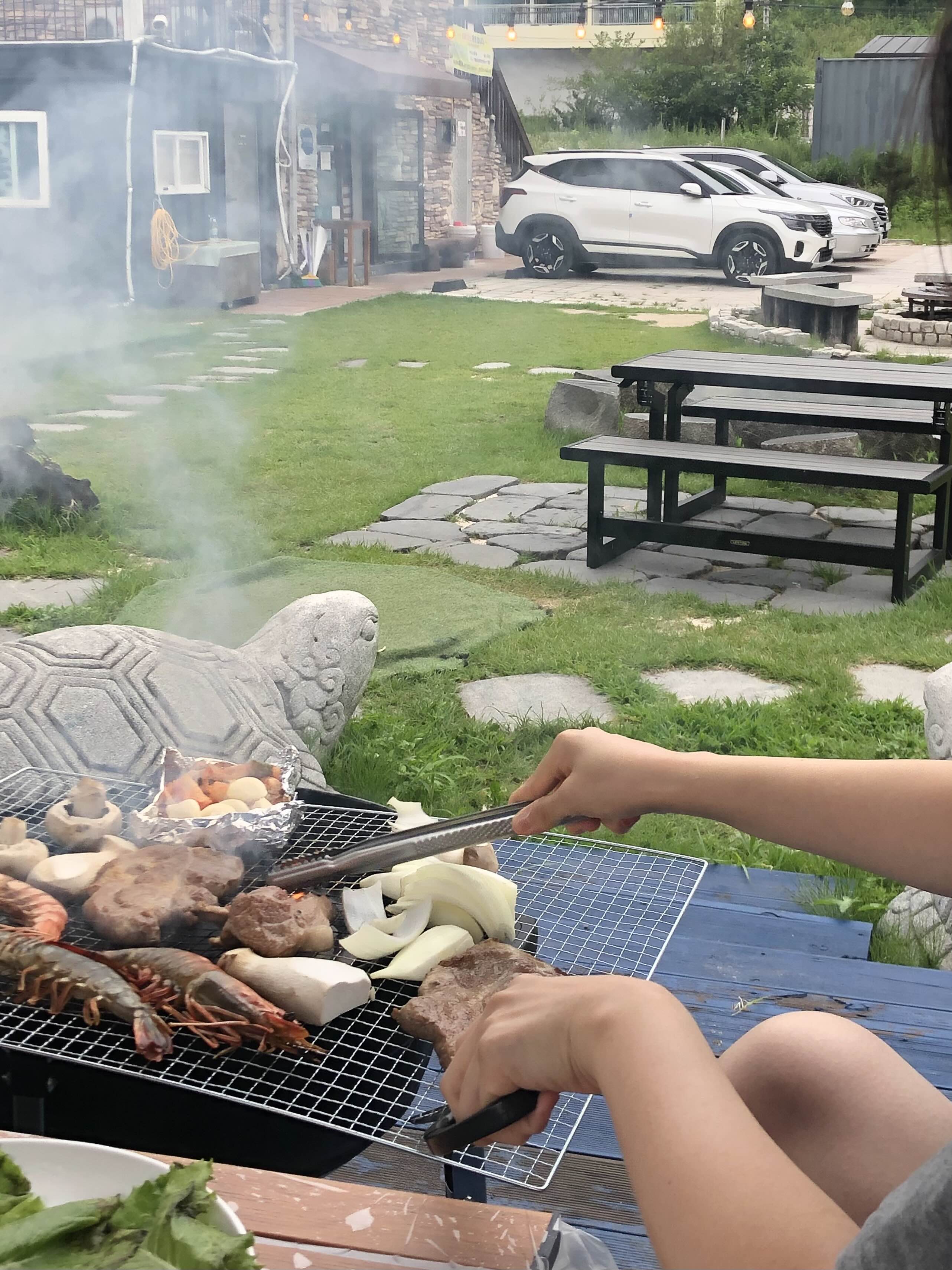 이 날도 역시 목살과 새우~! 굽는 건 내 담당 ㅎㅎ 새우 냄새를 맡고 고양이가 왔다. 펜션 아주머니가 물도 주고 사료도 놔두던데 관리 하는 것 치고는 꼬질해보이는 아이였다. 다른 팀에게서 고기를 받아먹고서는 먹자마자 수영장 물을 막 마시는 걸 보고,,, 새우는 주지 않았다. 짜워서 먹으면 안돼 바부야 ㅠㅠ