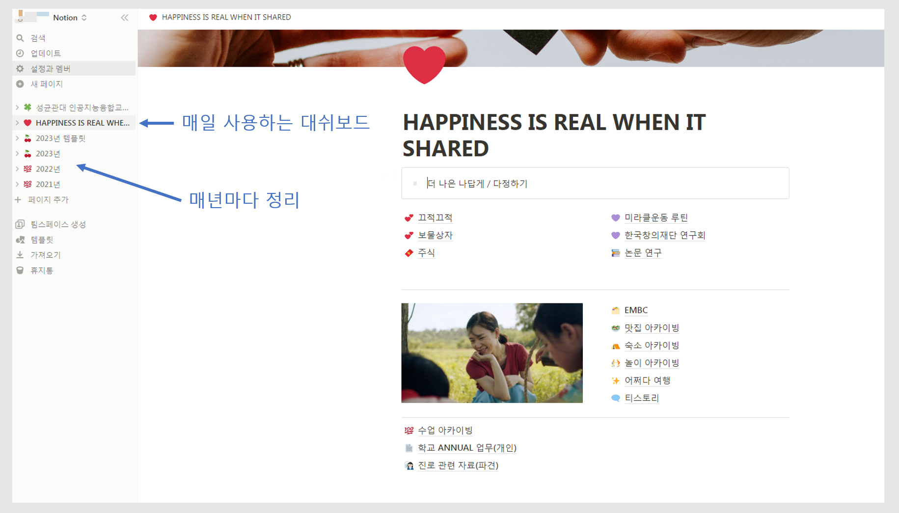 위에 보이는 화면은 제가 매일 사용하는 대쉬보드입니다. 일기, 할 일, 자료 정리 등등 많은 내용이 매일 쌓여갑니다. 그 중 상단의 6개 페이지 정도는 가독성을 위해 해당 년도의 페이지를 따로 만들어 매년 정리하고 있습니다. 벌써 노션 사용한지도 3년째네요✨