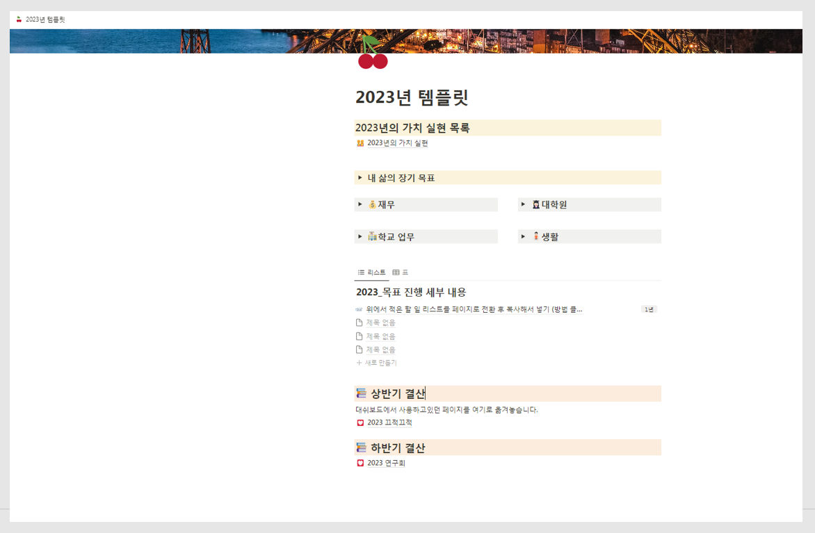 예를 들어서 저는 연초에 '2023년' 페이지(아래 템플릿)를 만들었고, 올해의 목표를 정해두었습니다. 중간중간 결산도 하고, 잘 하고 있는 것은 스스로 응원도 하고 부족한 것은 채워넣기도 합니다. 연말에는 대쉬보드에서 사용했던 페이지들을 '2023년' 페이지로 옮깁니다.(복사 아니고 옮기기 합니다) 그리고 메인 대쉬보드에는 다시 새롭게 페이지를 만들어 그 해의 내용을 쌓아가고 있습니다. 내용은 아래와 같습니다. 위쪽은 목표, 중간은 진행 상황이나 느낀점, 아래쪽은 결산 파트입니다. 깔끔하게 보이도록 필요한 내용만 넣었습니다. 맨 아래에 있는 링크 누르시고 오른쪽 상단에 '복제' 버튼 누르면 본인의 노션 페이지로 가져가기가 가능합니다. 가져간 이후에는 이미지 등 추가하고싶은 내용 더 넣어서 사용하세요~!